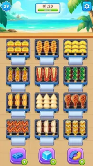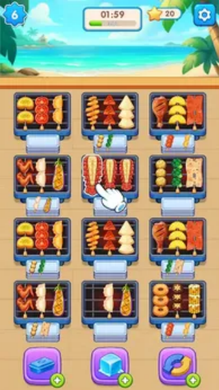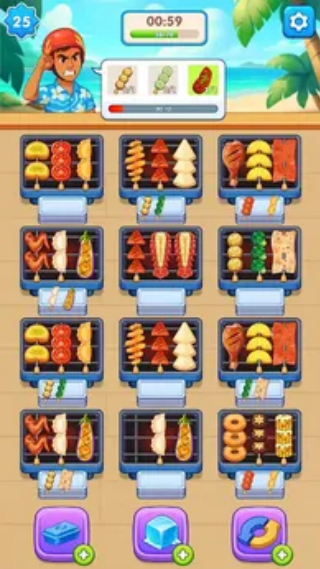 4.游戏拥有丰富的进度系统,记录着玩家从烤串新手到排序大师的成长轨迹,完成订单获得金币,可用于升级厨房设备、解锁新食材和特殊工具。
