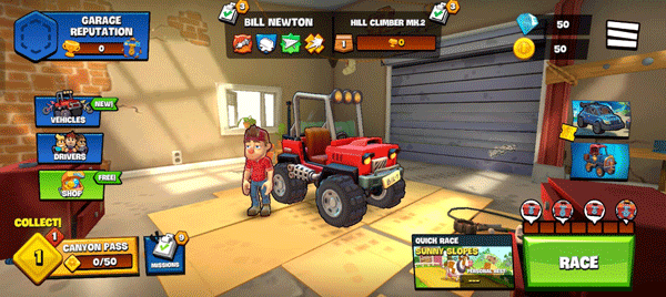 除了比尔·牛顿(BillNewton)之外,我们还将推出一系列来自《爬坡峡谷》(HillClimbCanyon)的角色供您解锁。每位车手都拥有独特的特质,让他们脱颖而出。您会选择时尚前卫、能表演精彩空翻的尼基塔(Nikita),还是隐藏着强大助推装置的瑞克·艾斯(RickAce)?