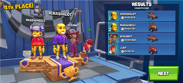 6、最终根据玩家的时间进行结算排名,点击NEXT返回界面;